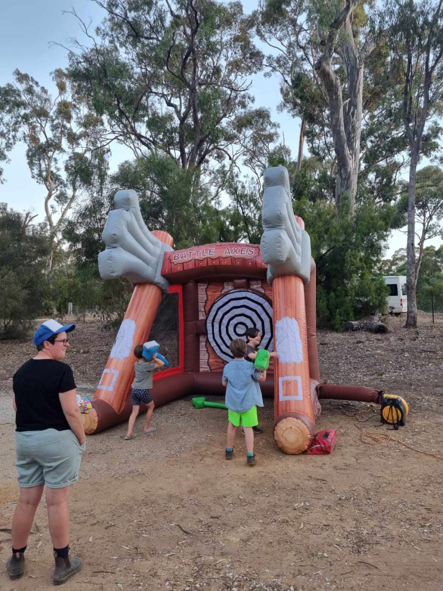 At Melbourne Bull Hire, we offer an exciting and unique inflatable velcro axe throwing game that is perfect add on for any event. Our inflatable target is designed with a bullseye and surrounded by velcro that securely hold the foam axes in place when they hit the target. This activity is a perfect choice for corporate events, team building activities, birthday parties, and other special occasions.