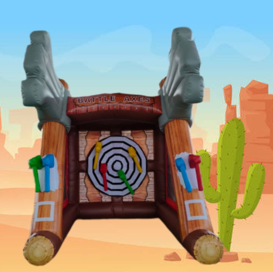 The game comes with an electric blower that inflates the target in just a few seconds, Once the game is set up, players can take turns throwing the foam axes at the target and score points when they hit the bullseye.